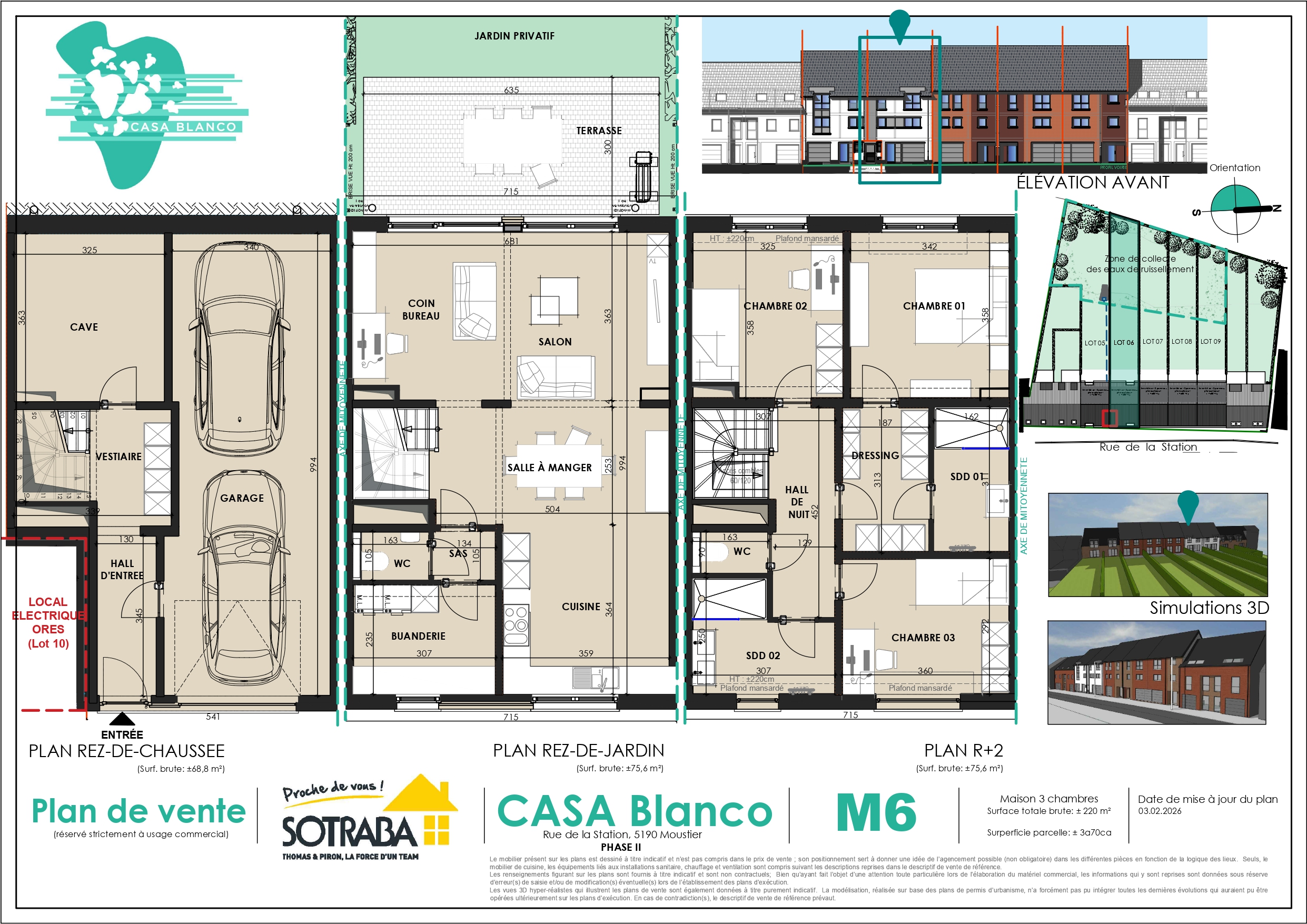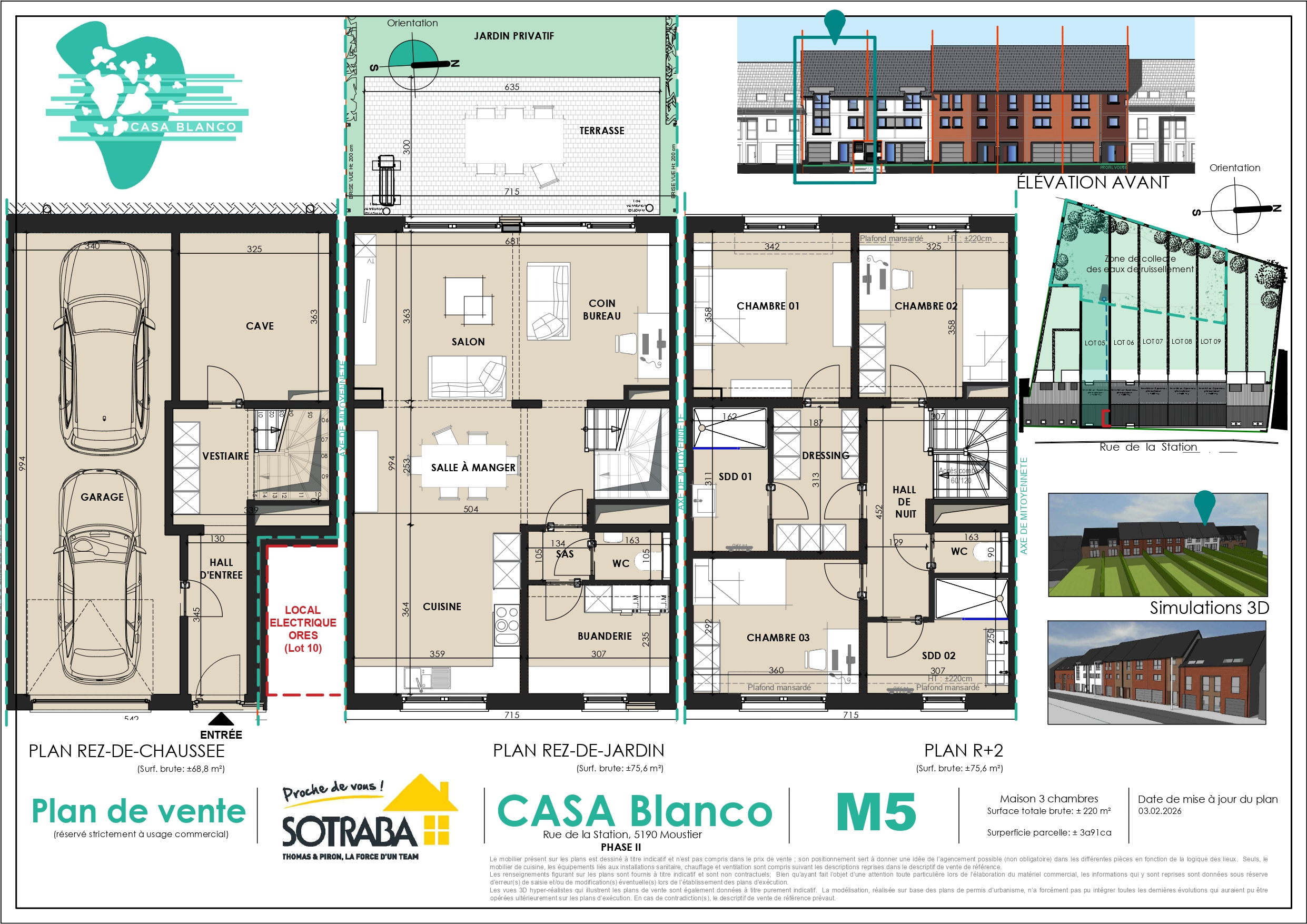 Cette deuxième phase du projet « Casa Blanco » propose 5 maisons contemporaines de type « bel étage » avec 3 chambres et une surface habitable comprise entre ± 222 m² et ± 227 m² brut. Elles se composent d’un rez-de-chaussée avec garage pour deux voitures, cave et hall d’entrée avec coin vestiaire. Le premier étage accueille une grande pièce de vie lumineuse avec salon, salle à manger, cuisine ouverte et coin bureau, ainsi qu’une buanderie et un WC séparé, avec accès à une terrasse et au jardin. Le deuxième étage se compose d’un hall de nuit, de trois chambres dont une suite parentale avec dressing et salle de douche, d’une salle de bains et d’un WC séparé. Les combles sont aménageables en supplément selon vos besoins.
