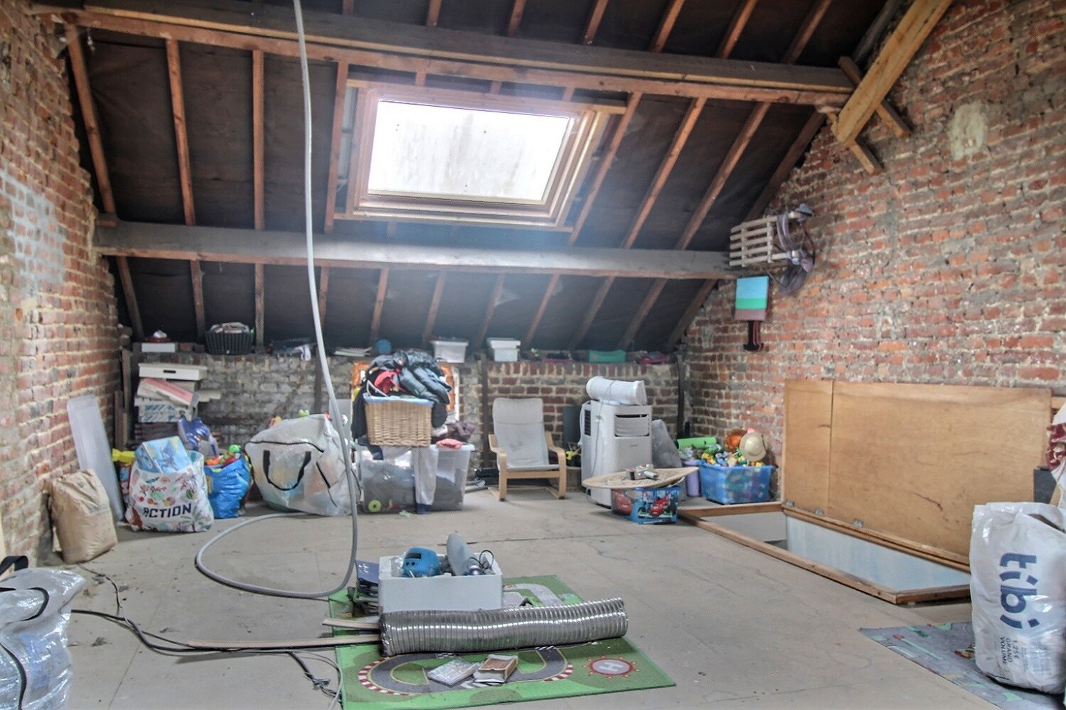 À l’étage, la maison dispose de trois belles chambres confortables (+/- 16, 12 et 12,5 m²), d’une salle de bains fonctionnelle et d’un grenier aménageable de 36 m² accessible par escalier.