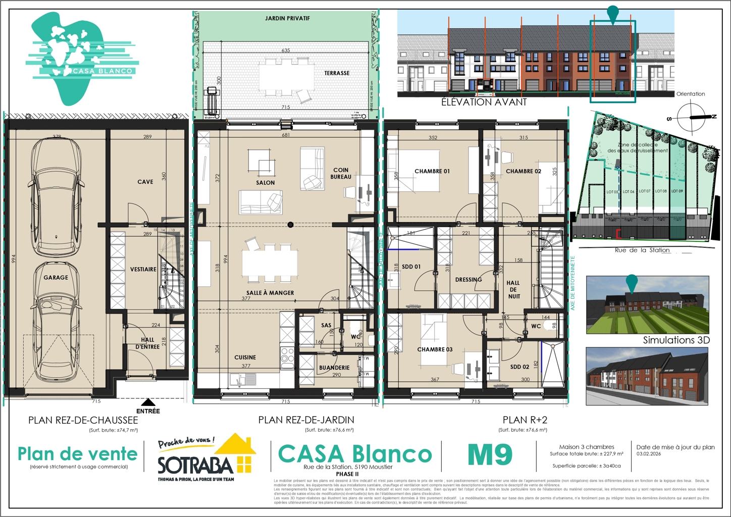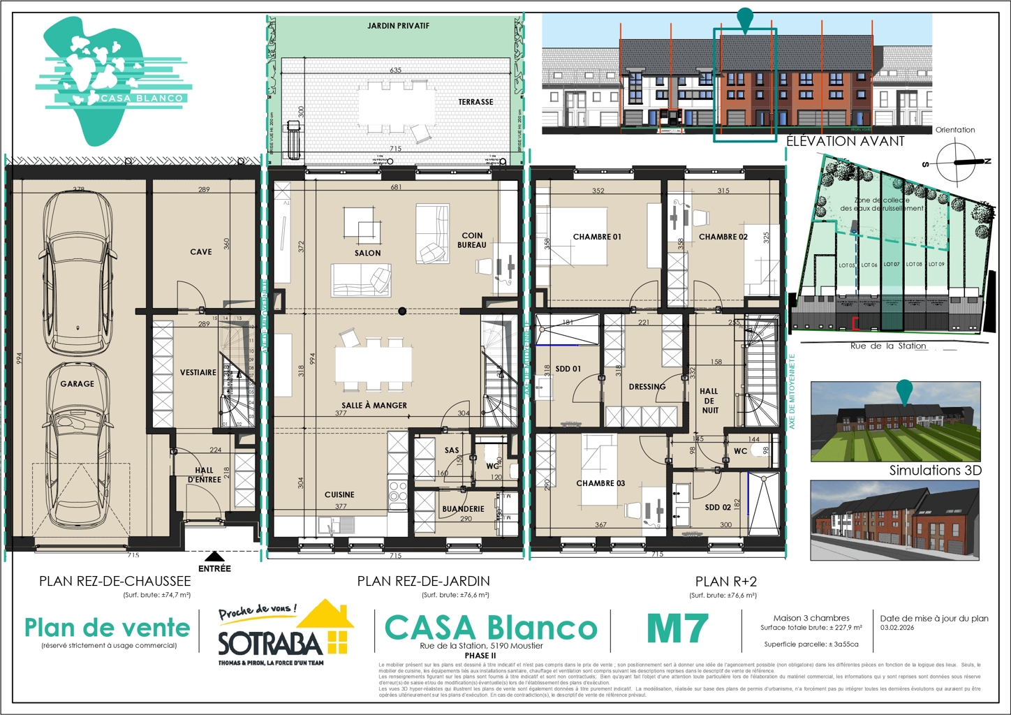 Cette deuxième phase du projet « Casa Blanco » propose 5 maisons contemporaines de type « bel étage » avec 3 chambres et une surface habitable comprise entre ± 222 m² et ± 227 m² brut. Elles se composent d’un rez-de-chaussée avec garage pour deux voitures, cave et hall d’entrée avec coin vestiaire. Le premier étage accueille une grande pièce de vie lumineuse avec salon, salle à manger, cuisine ouverte et coin bureau, ainsi qu’une buanderie et un WC séparé, avec accès à une terrasse et au jardin. Le deuxième étage se compose d’un hall de nuit, de trois chambres dont une suite parentale avec dressing et salle de douche, d’une salle de bains et d’un WC séparé. Les combles sont aménageables en supplément selon vos besoins.