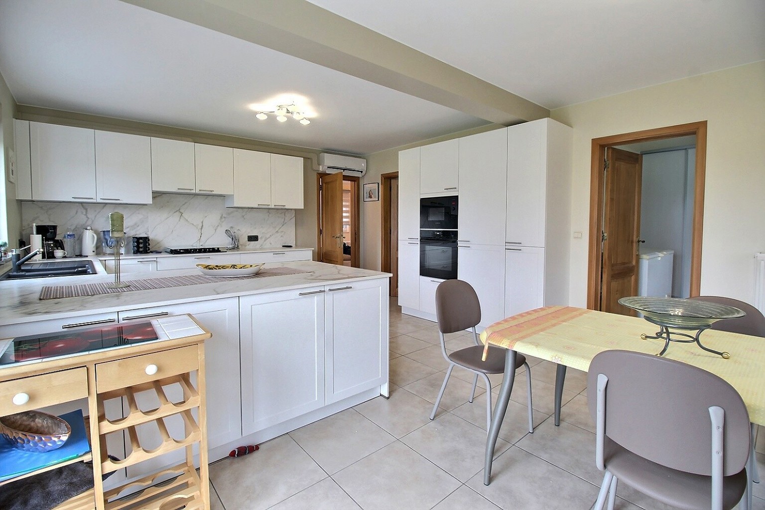 Le rez-de-chaussée accueille un hall d’entrée avec espace vestiaire et WC, une buanderie pratique avec rangements intégrés, un vaste séjour lumineux et convivial, ainsi qu’une cuisine neuve entièrement équipée (2024). Le coin salon, doté d’une cassette au bois, crée une atmosphère chaleureuse et accueillante. La villa dispose également d’une suite parentale au rez-de-chaussée avec dressing et salle de bains privée comprenant douche, baignoire et WC, idéale pour un confort maximal.